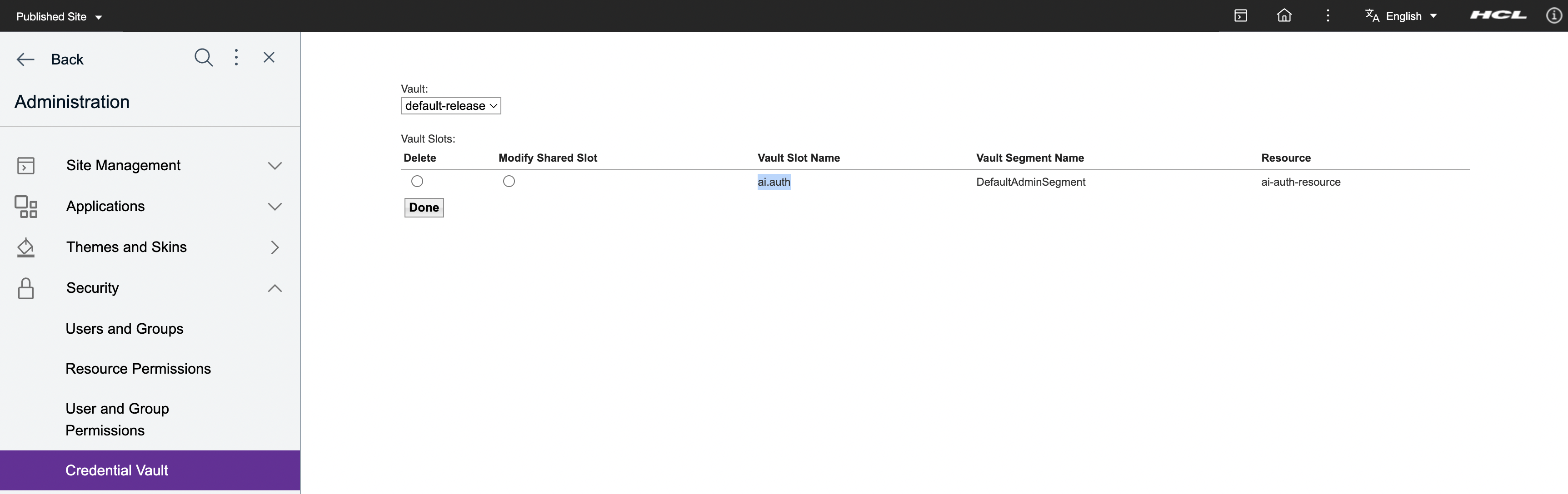 ai.authis configured using the AI content provider's API key by clicking Administration > Security > Credential Vault > Manage System Vault Slot.