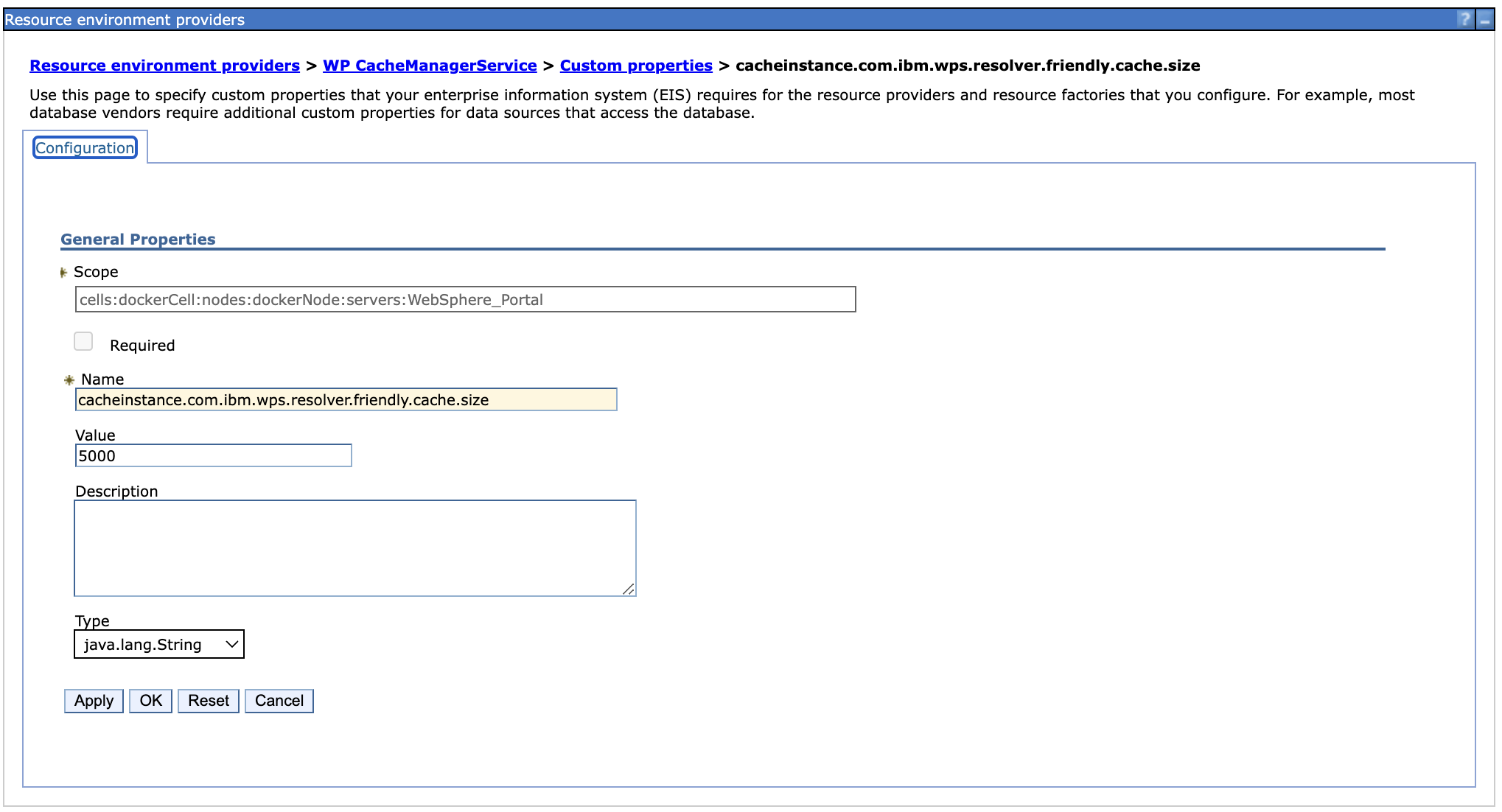 Added a new custom property under Resource environment providers > WP CacheManagerService > Custom properties > cacheinstance.com.ibm.wps.resolver.friendly.cache.size.