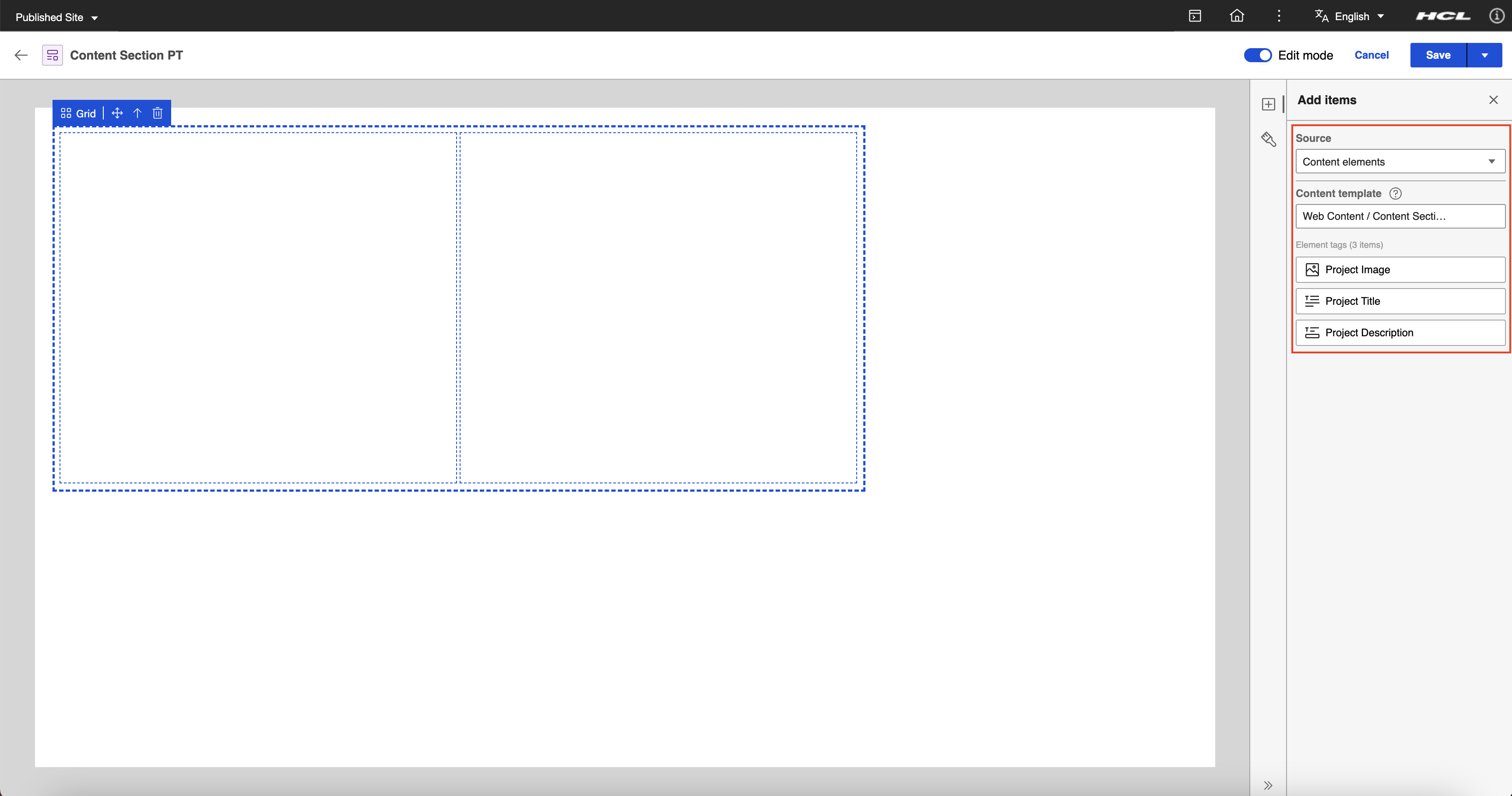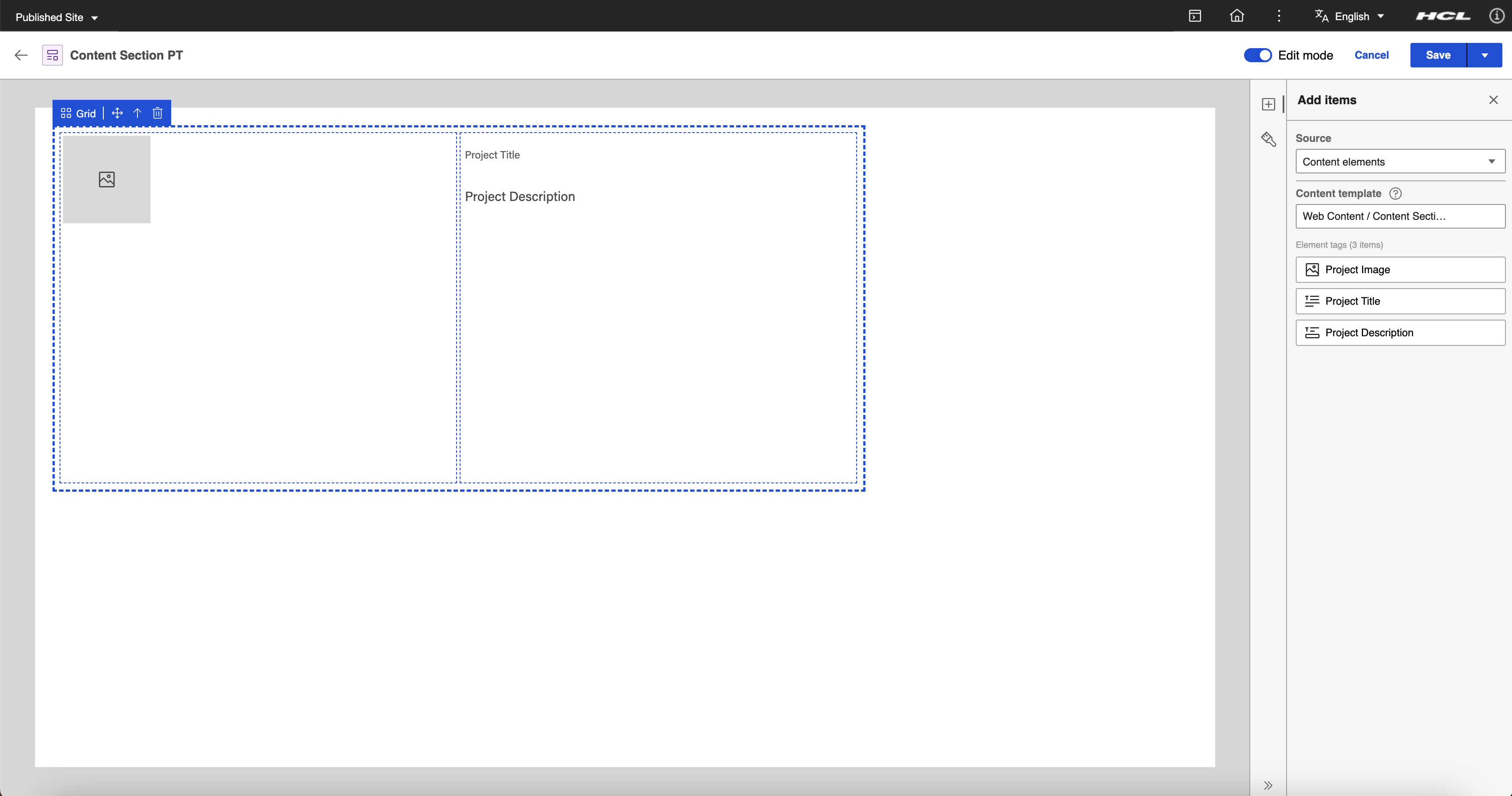 In the Add Items panel, set the element source to Property tag then drag and drop the Last modified date property tag under the Project Description (Rich Text Content Element).