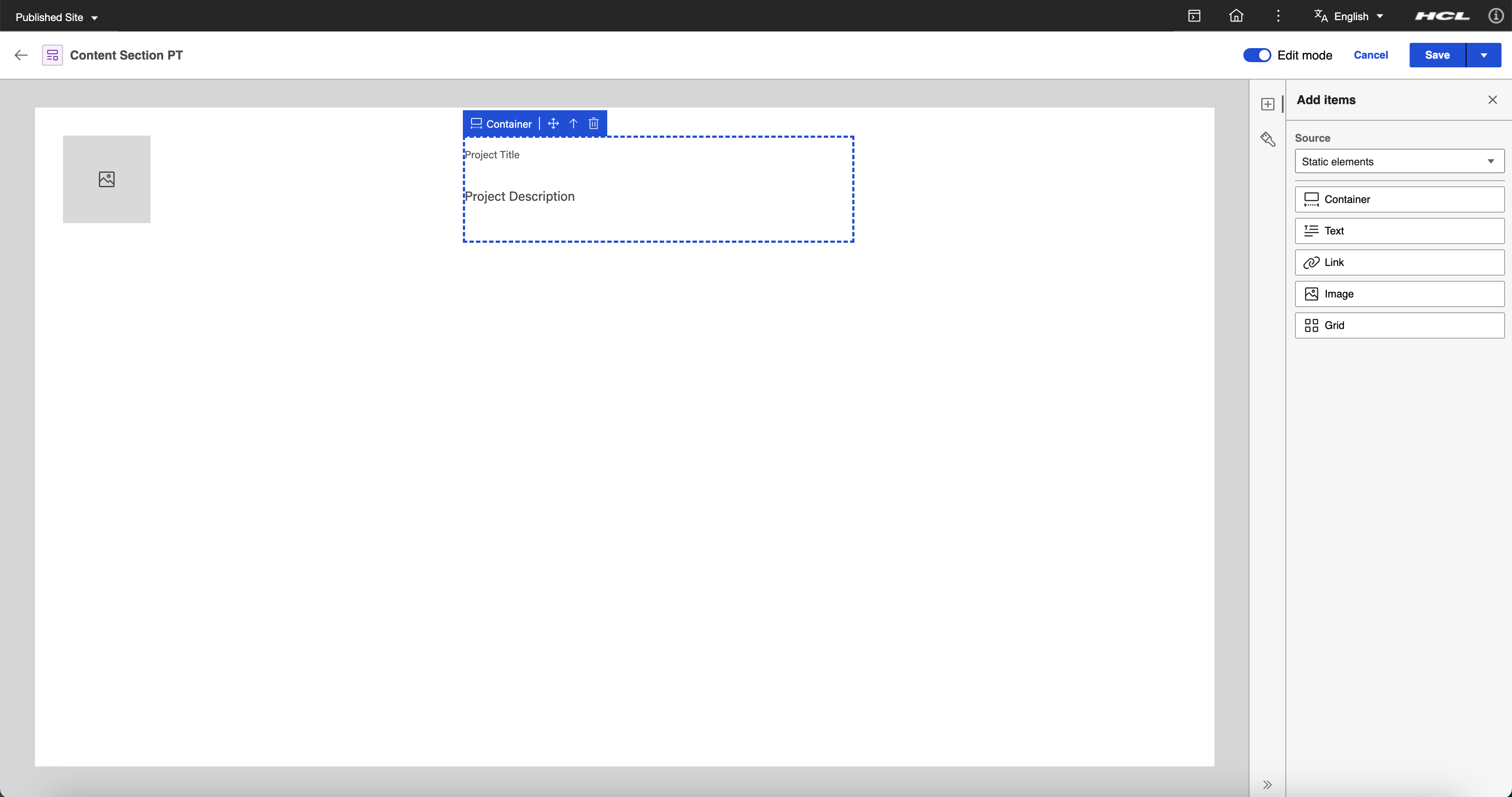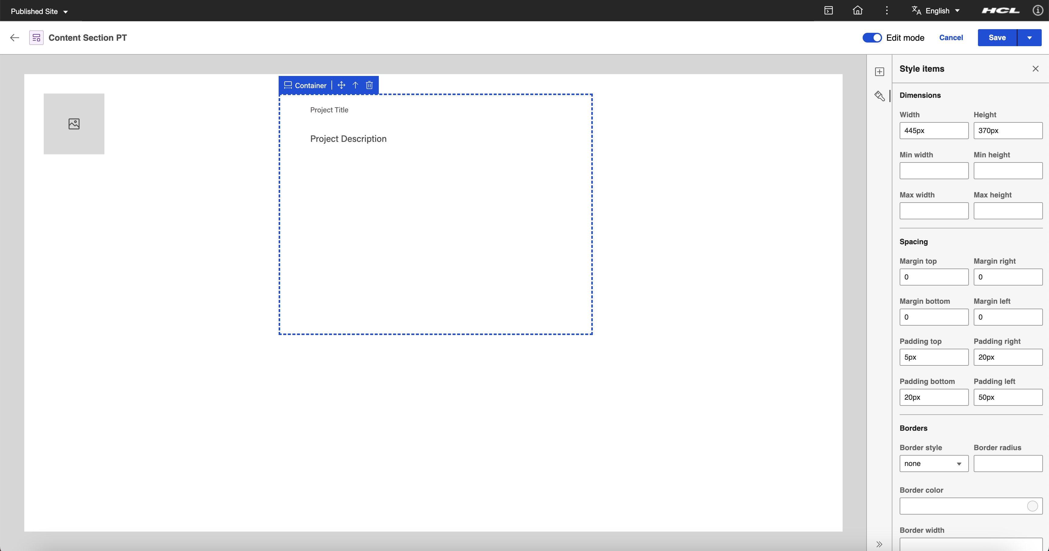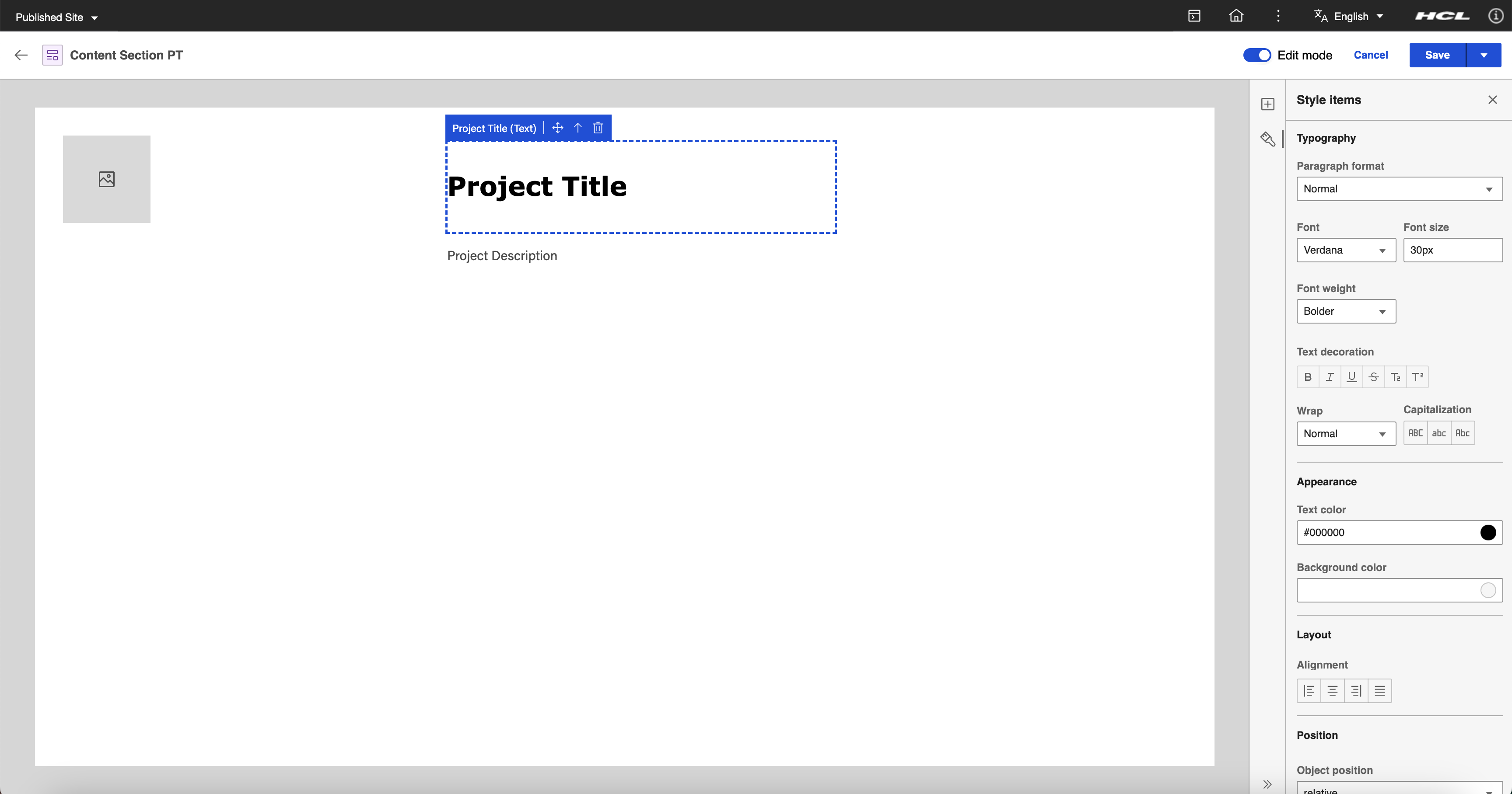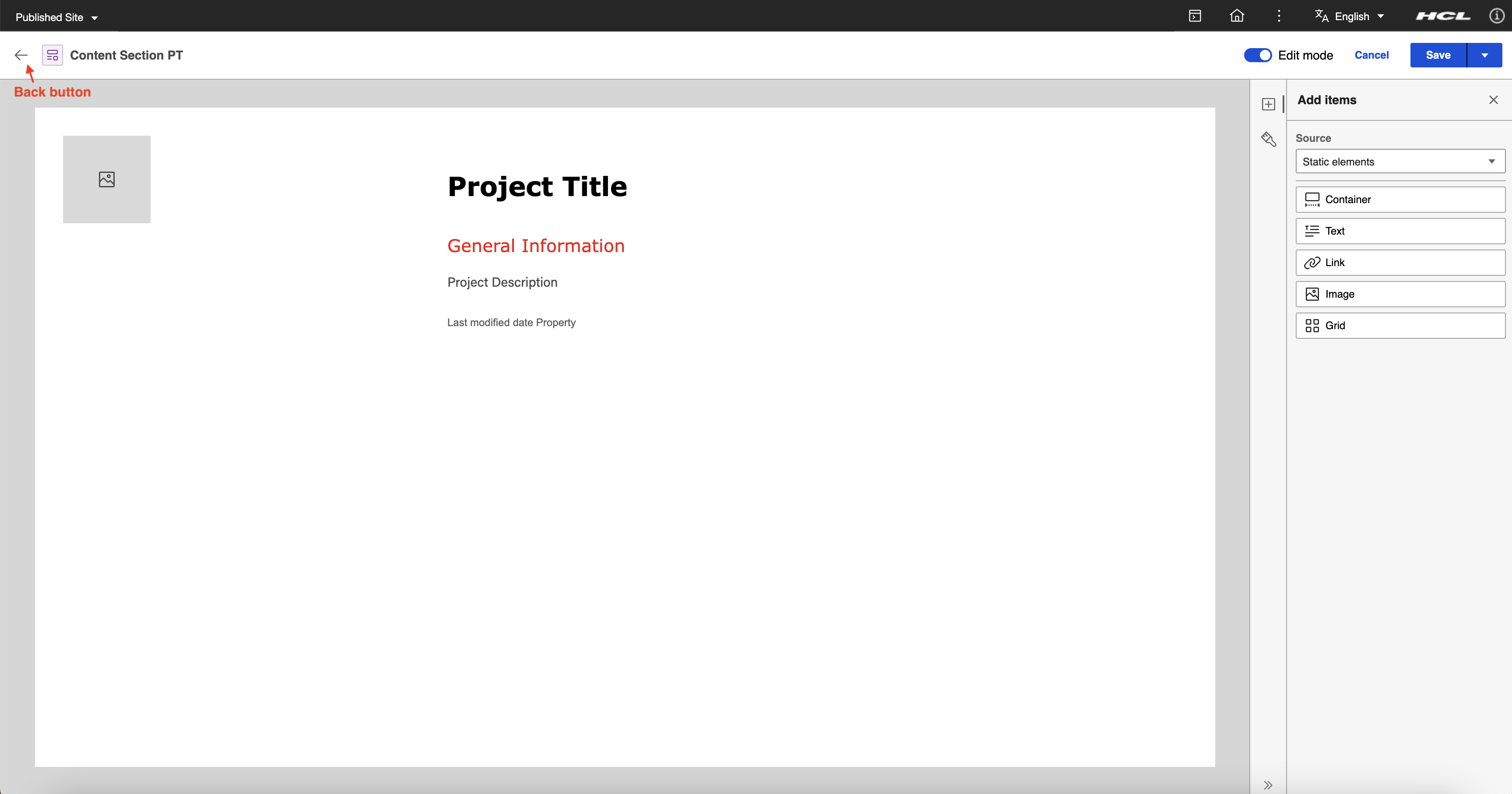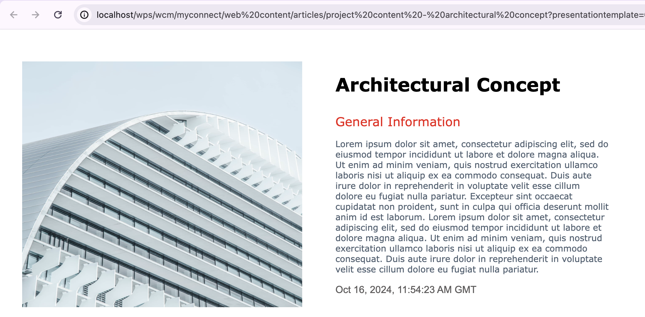 To provide a comprehensive example, the goal is to have a Content Section presentation template for a project page which displays an image of the project, the project title, and general information by utilizing the capabilities of Presentation Designer.