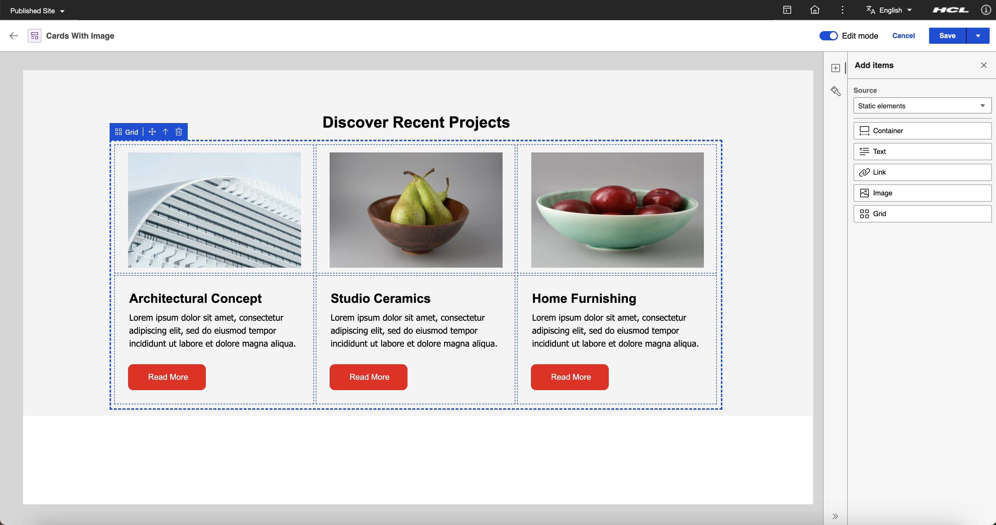 Create two or more content items using the created content template and add different content to the image, text, and rich text elements for each content item. For more information on how to create a content item, see Author Content Items.