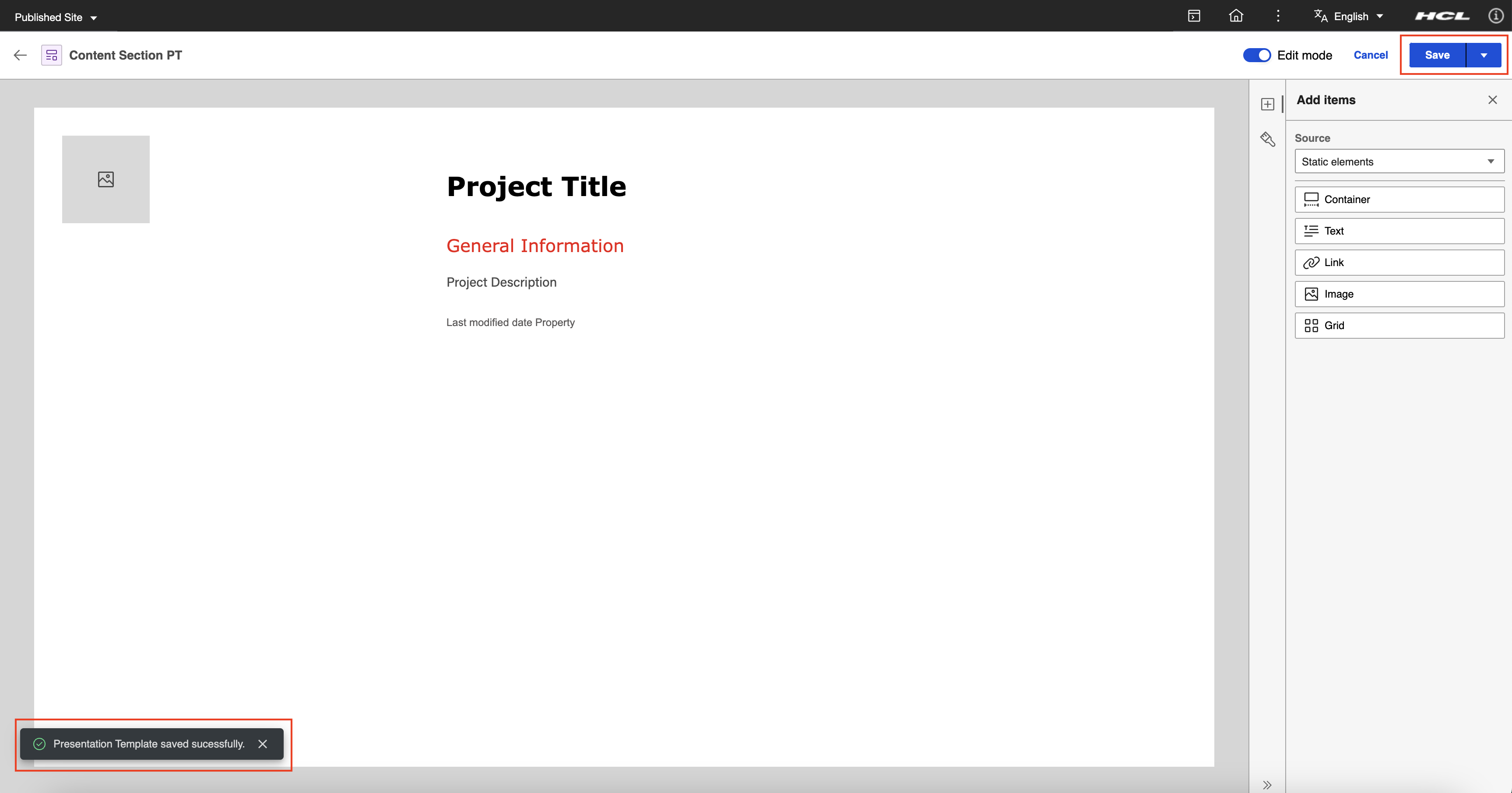 Click Save to confirm your changes to the presentation template. The message "Presentation Template saved successfully." appears on the screen.
