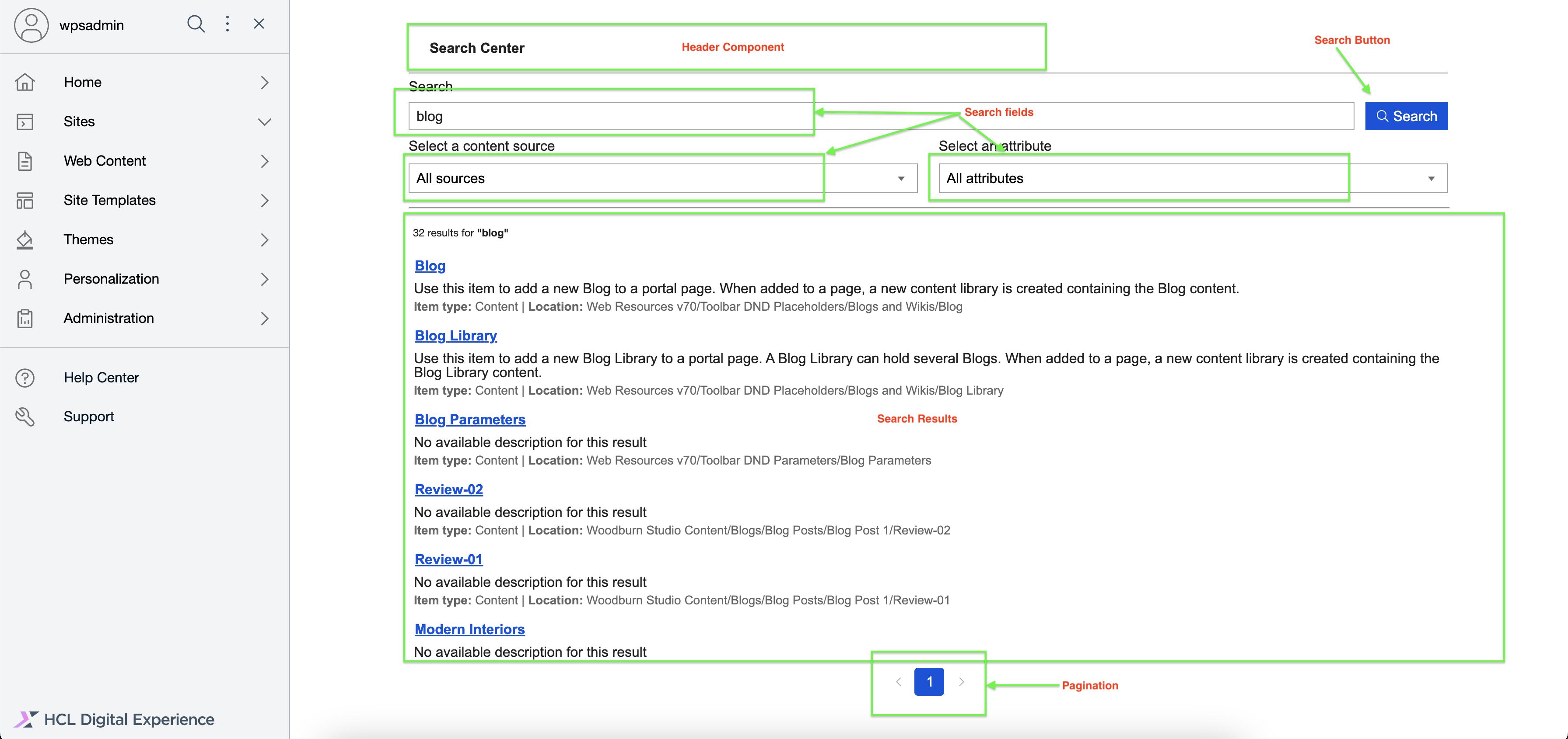 - Search Input - This section displays the fields the user can interact with to modify the search parameters before clicking Search. There are three fields: the search field, the content source dropdown, and the search attribute dropdown.