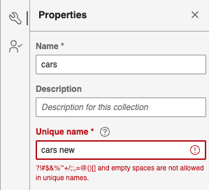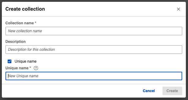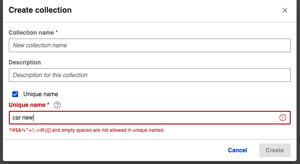 - Collection unique-name is an optional field. If it is not provided by the user, the system will generate a collection unique-name based on the collection name replacing all the URL reserved characters (e.g. "?!#$&%'*+/;:,=@()[]") with underscores.