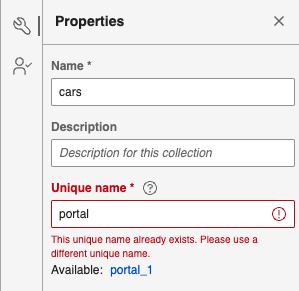 While creating or editing a collection, DAM checks for any duplication of the unique-name and prompts with an error message. It also suggests an available unique-name if a duplicate is found in any other collection.