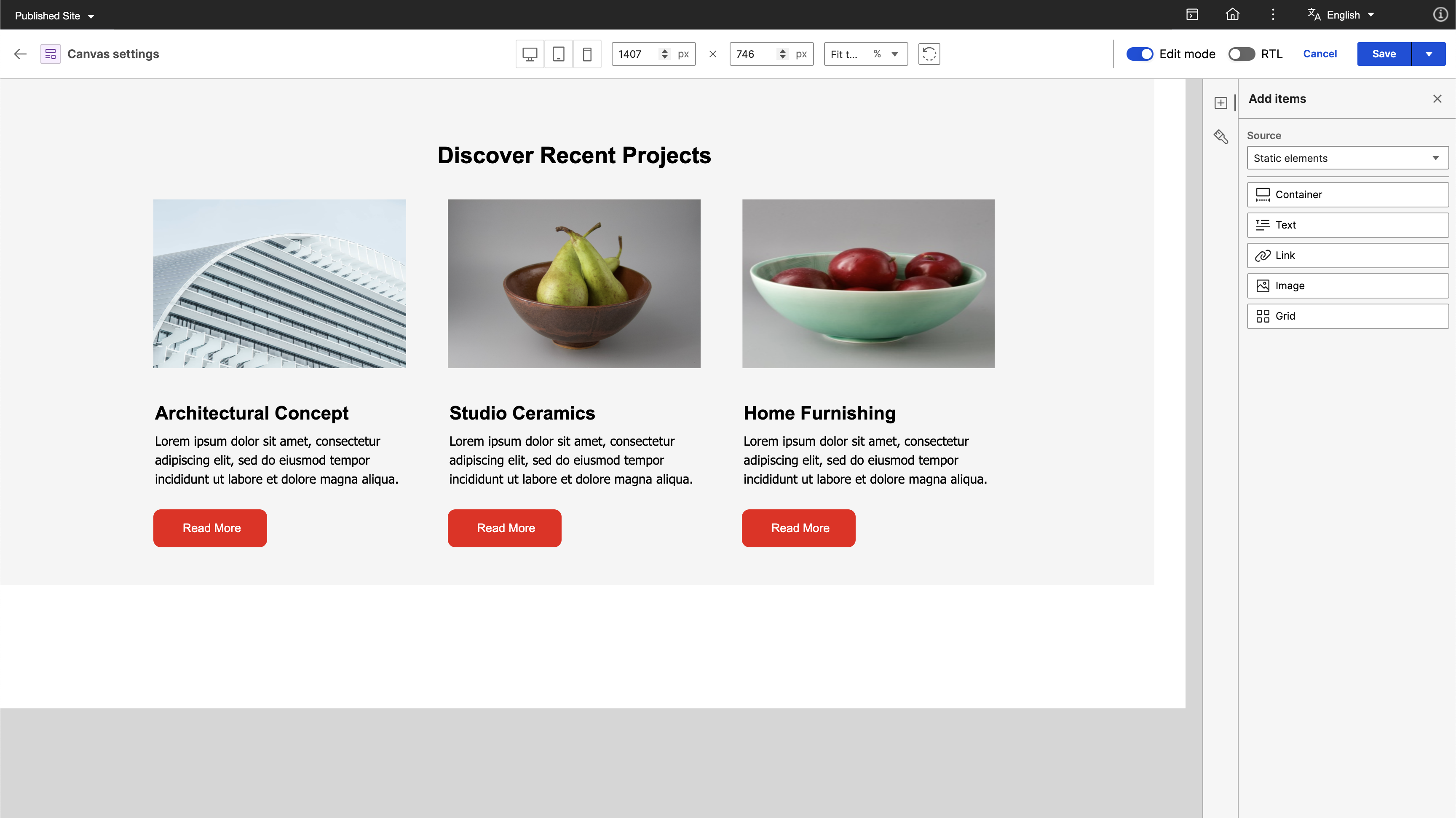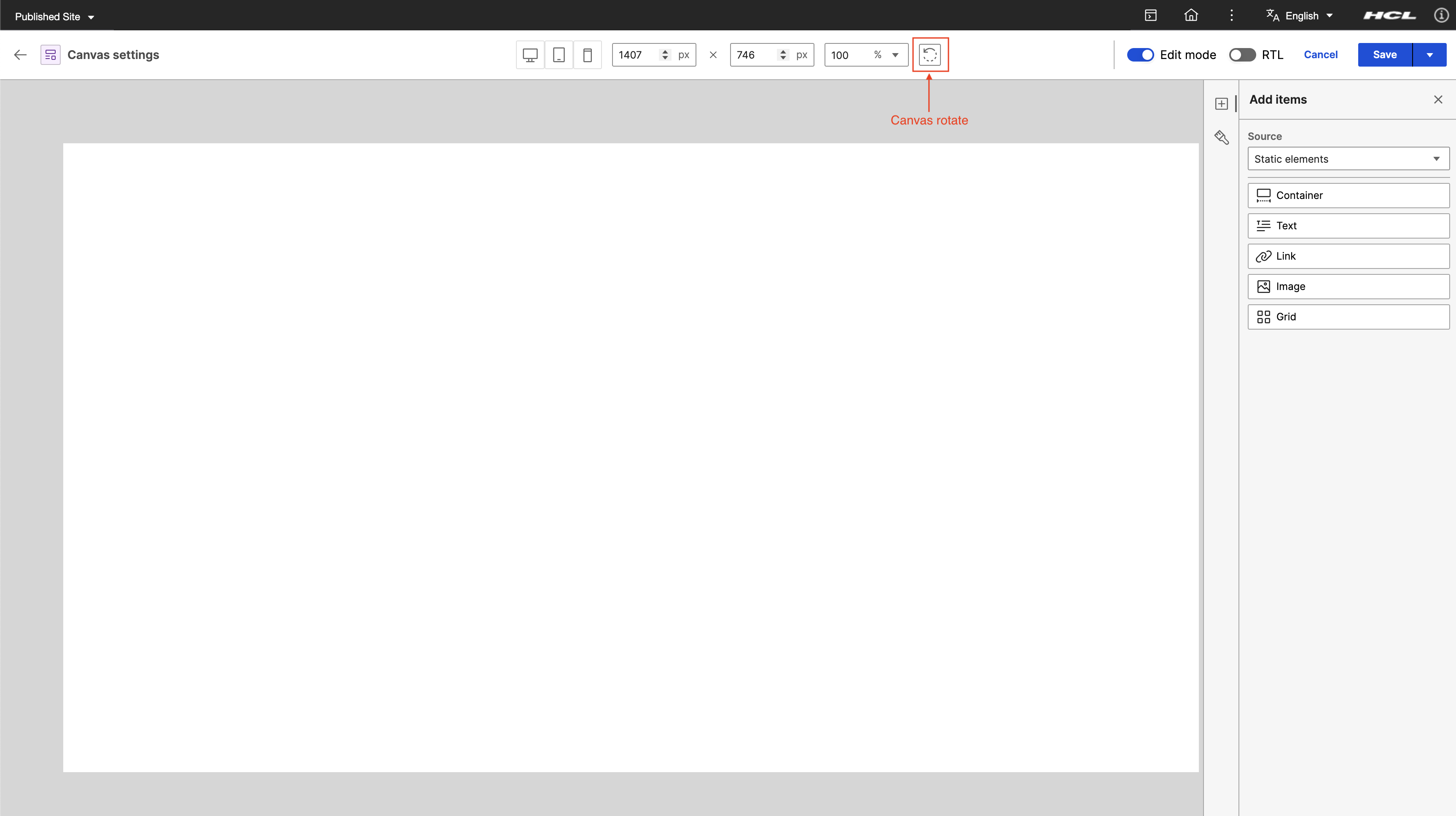 The canvas dimensions settings in Presentation Designer can be used to set the width and height of the canvas to adapt to specified size requirements. You can also use the dimensions settings to select from predefined sizes such as Desktop, Tablet, and Mobile.