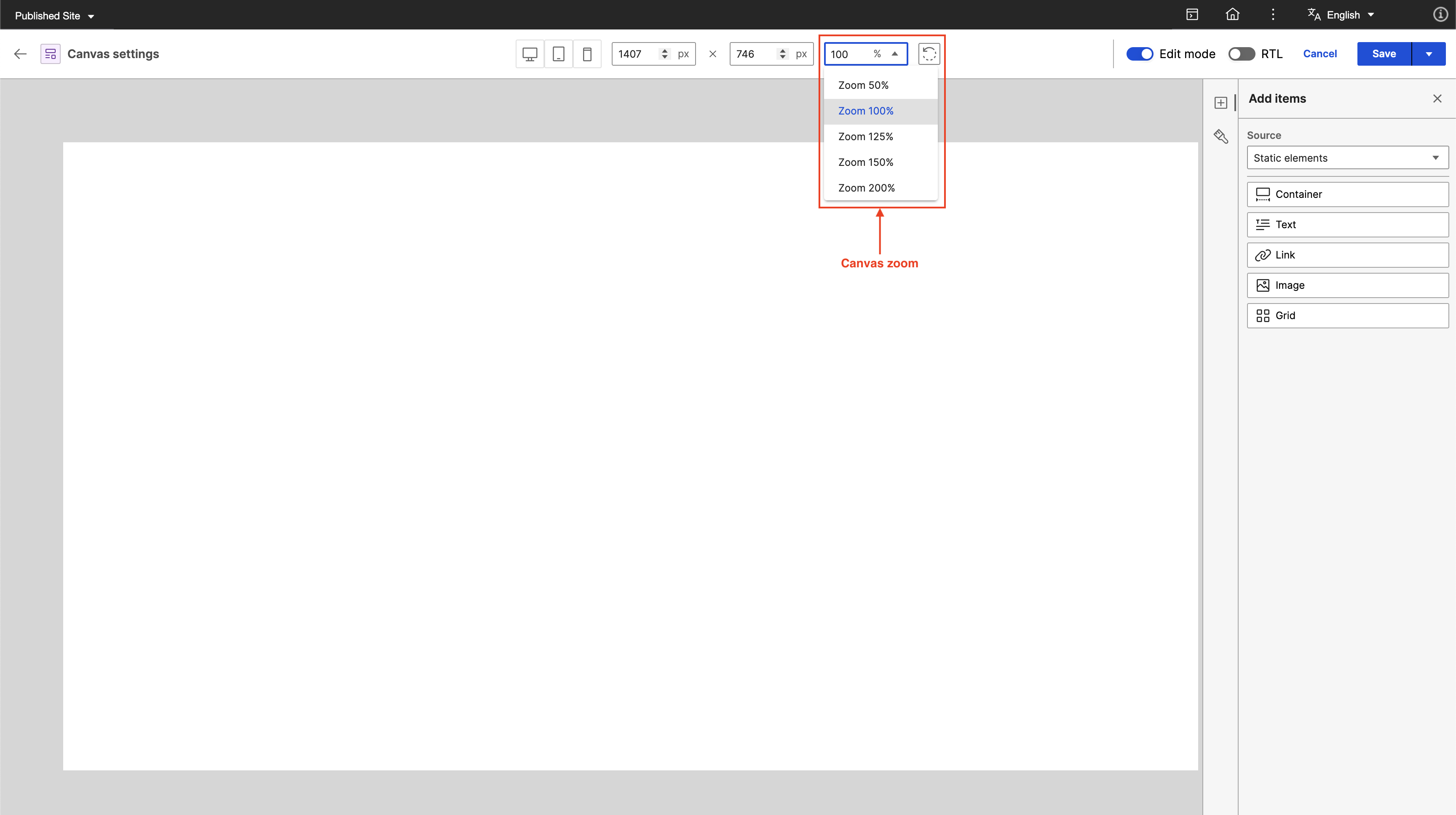 In the Zoom field, you can select how much you want to zoom in or out of the canvas. There is a minimum zoom level of 50% up to a maximum of 200%. You can also select a zoom level to fit your window.