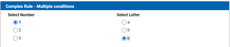 This example demonstrates a rule using multiple condition groups. The field will be visible if '1' and 'a' or '2' and 'b' are selected.