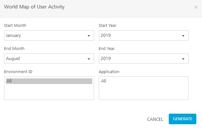 The World Map of User Activity report provides information about user session based on the geolocation of a country.