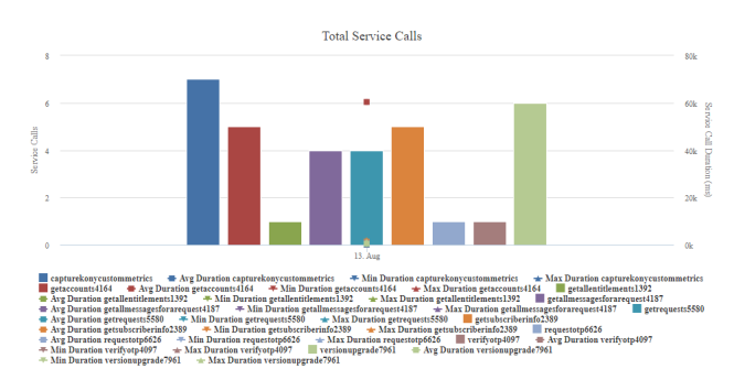 The Service Duration report provides you the information about the total number of calls per application service request. It includes minimum, average, and maximum time taken for the selected aggregation level.