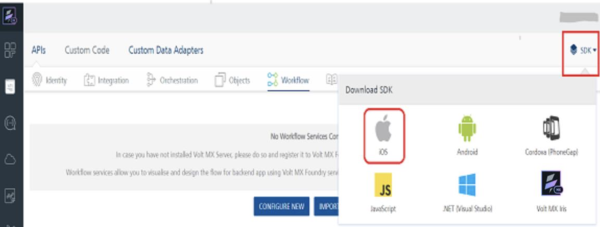 1. In Volt MX Foundry console, navigate to Apps > SDKs, and click iOS. The system prompts you to save the zip file in your local system.