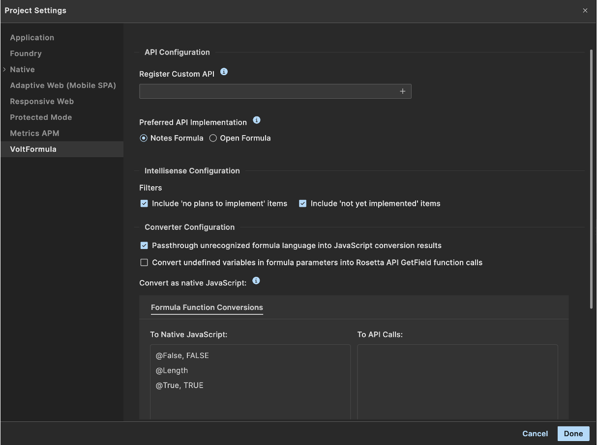 Intellisense Configuration Allows you to include or exclude names of formulas that won't be implemented and not yet implemented in the formula list IntelliSense. When Include no plans to implement items is selected, the names of the formulas that won't be implemented are shown as strikethrough text. If Include not yet implemented items is selected, the names of the formulas that aren't yet implemented are shown but appears dimmed.Converter Configuration Allows you to configure options related to how formulas are converted into their corresponding Rosetta-enabled JavaScript. Passthrough unrecognized formula language into JavasSript conversion results Allows you to specify whether the converter allows unrecognized formula code to be part of the JavaScript conversion results without any massaging, or if it should throw an error when encountering unrecognizable formula code. This allows greater flexibility but also exposes the API to injection of code. Use with care. Convert undefined variables in formula parameters into Rosetta API GetField function calls Allows you to specify whether to handle unknown or undefined variables in formula parameters as variable or to convert them into Rosetta API GetField function calls Convert as native JavaScript Allows you to specify whether the converter uses native JavaScript or API calls for methods where a native JavaScript function exists. For example, convert @If( )